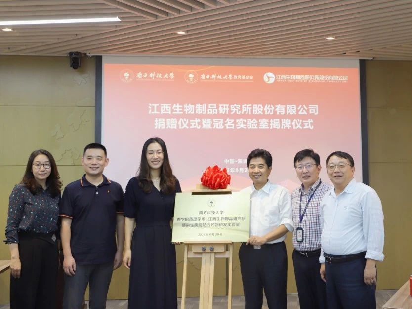 2023年(nián)9月(yuè)26日(rì)下(xià)午,江西(xī)生(shēng)物(w↔ù)制(zhì)品研究所股份有(yǒu)限公司向南(nán)方科(kē)技(jì)大(dà)學捐贈儀式暨冠名實驗室揭牌儀式。捐贈方代表江西(xī)生(shēng)物(wù)制↑(zhì)品研究所股份有(yǒu)限公司(簡稱江西(xī)生(shēng)物(wù))董事(shì)長(ch↑áng)敬玥、行(xíng)政人(rén)事(shì)總監張愛(ài)萍,南(nán)方科(kē)技(jì)大"(dà)學校(xiào)長(cháng)辦公會(huì)成員(yuán)、教育基金(jīn)會(huì)副理(lǐ)事(shì)長↔(cháng)葉秦,醫(yī)學院藥理(lǐ)學系系主任卞勁松、講席教授王鵬、助理(lǐ)教授李亮(liàng≈),教育基金(jīn)會(huì)秘書(shū)長(cháng)耿珺等出席。
